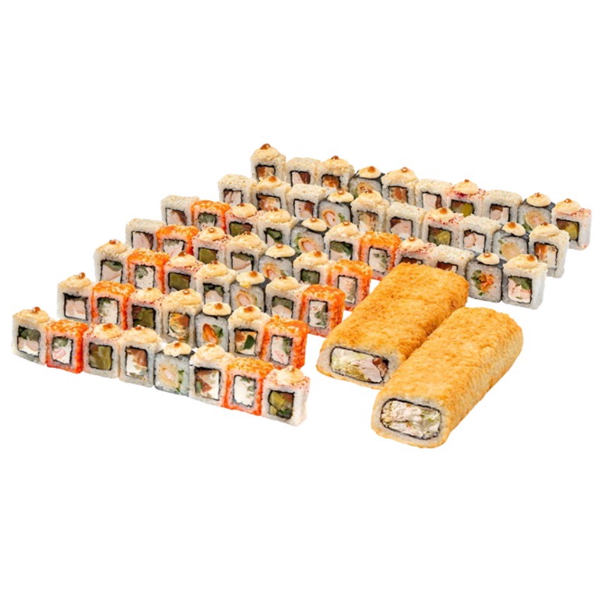 Набор '2 кг Счастья' включает в себя 60 аппетитных роллов с разнообразными начинками: хрустящая креветка в темпуре, нежный слабосоленый лосось, ароматная варено-копченая курица, пикантный маринованный редис такуан и нежный крем-краб.