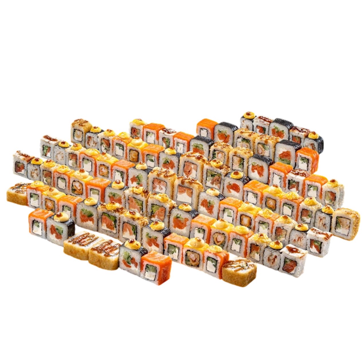24 ролла "Филадельфия" (16 классических и 8 "Филадельфия Хот"), а также разнообразные роллы с лососем, угрем и хрустящей креветкой в темпуре.