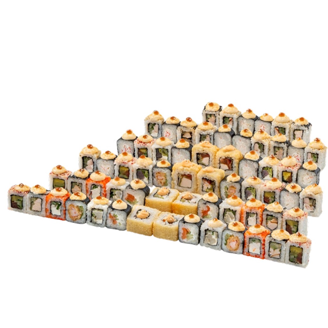 Включает в себя 64 аппетитных ролла с разнообразными начинками: нежный жареный окунь, пикантный слабосоленый тунец, хрустящая креветка в темпуре, классический слабосоленый лосось, изысканный крем-краб, ароматная варено-копченая курица и освежающий такуан.