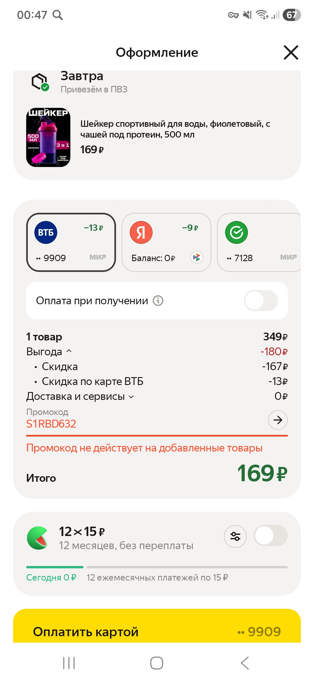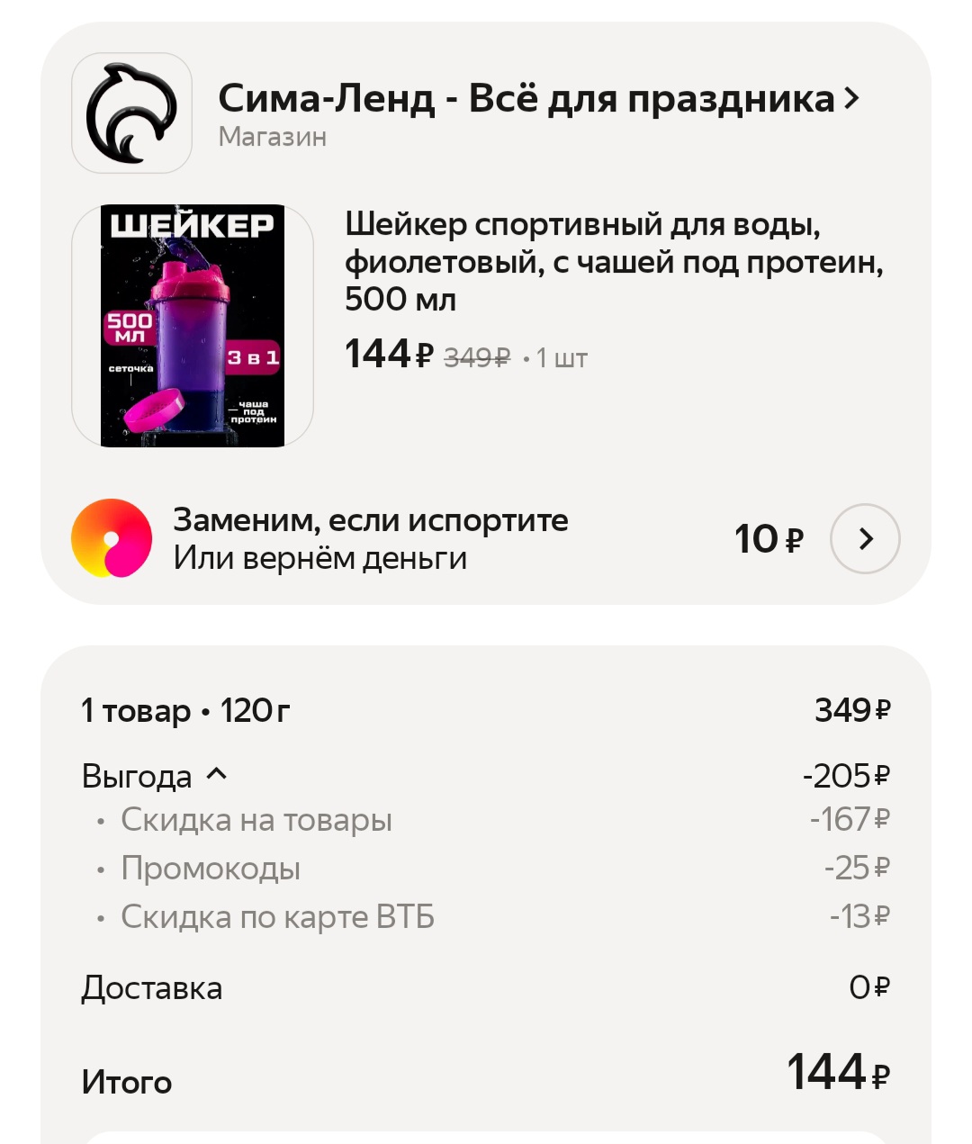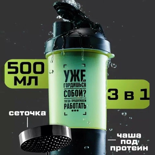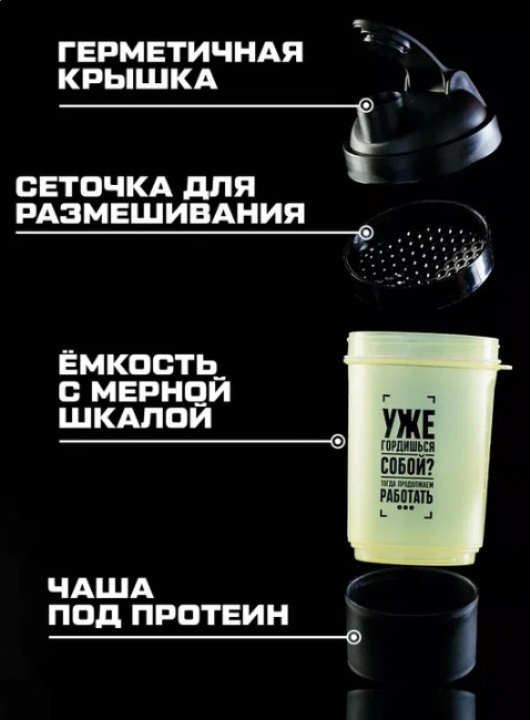 Он довольно вместительный - 500 мл, плотно закрывается. Есть сеточка, чаша под протеин, мерная шкала для удобства. Его легко разбирать и можно мыть в ПММ.