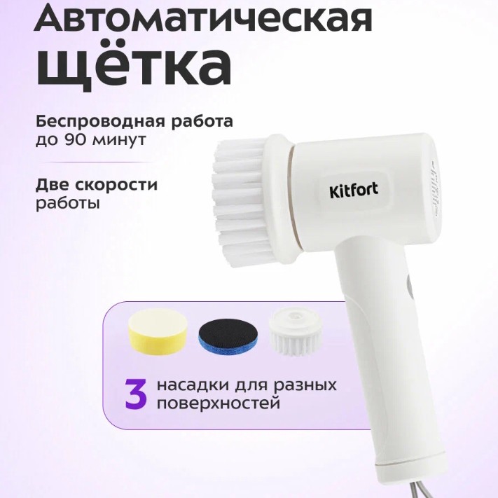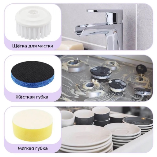 Работает от аккумулятора, до 90 минут хватает, зарядка обычная USB-C. В комплекте три насадки: жесткая губка для застарелых загрязнений, мягкая для посуды и легкой грязи, и щетка.