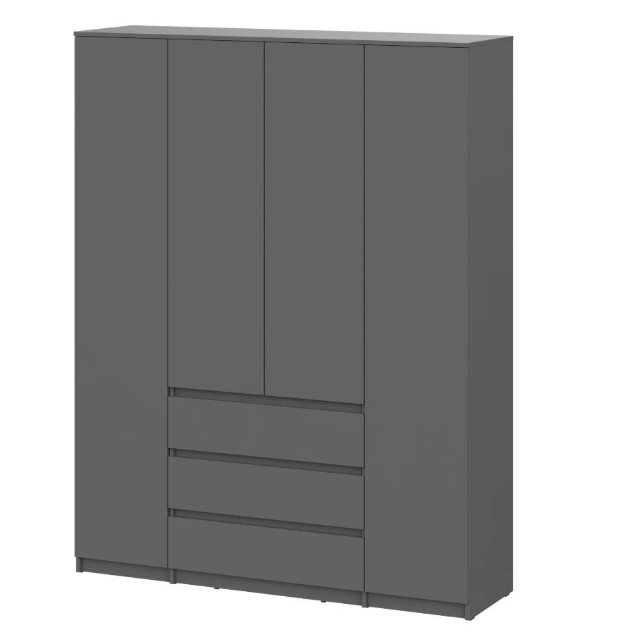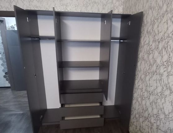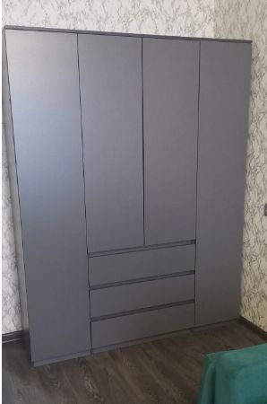 4-дверный, размер 160×46×205 см. 4 секции: полки, выдвижные ящики, штанга для вешалок. Нагрузка на полку до 10 кг.