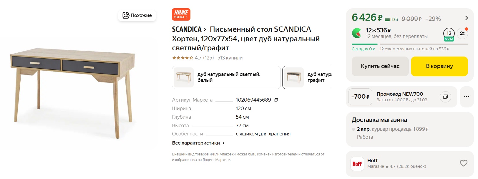 А если кому нужен в сером цвете выгодно можно взять письменный стол SCANDICA Хортен, 120х77х54 - 6426 рублей. В светлом тоне он 7252, но тоже хорошая цена