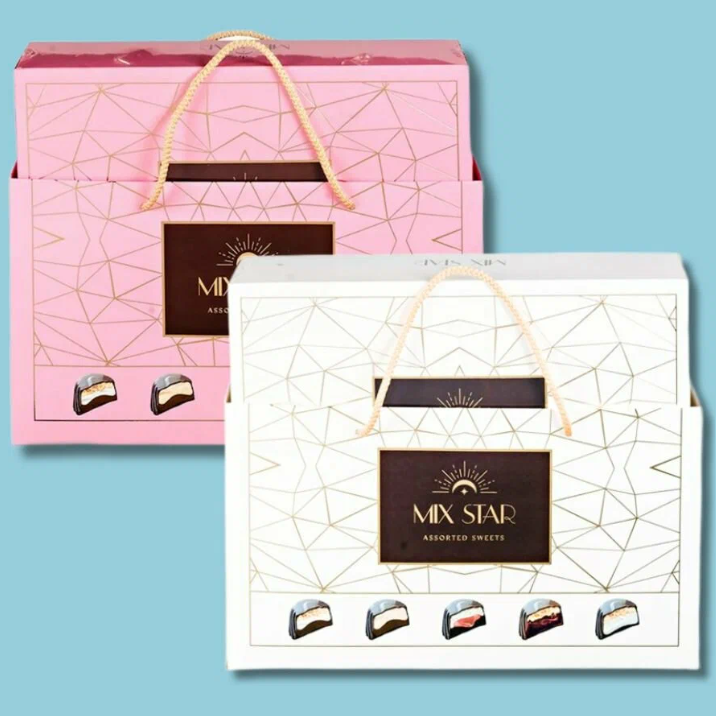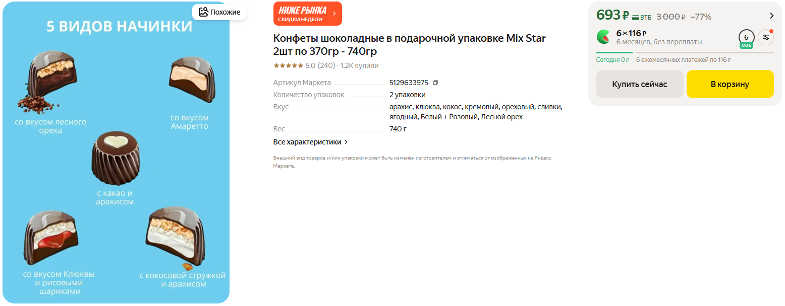 Набор из двух коробок, выходит 347 рублей за одну упаковку. Внутри ассорти с разными начинками: арахис, клюква, кокос, лесной орех, кремовые и ягодные вкусы. Каждая конфета в индивидуальной обёртке. Выглядят очень презентабельно, отличный вариант для сладкого подарка: коллегам, учителям, близким или просто к чаю.