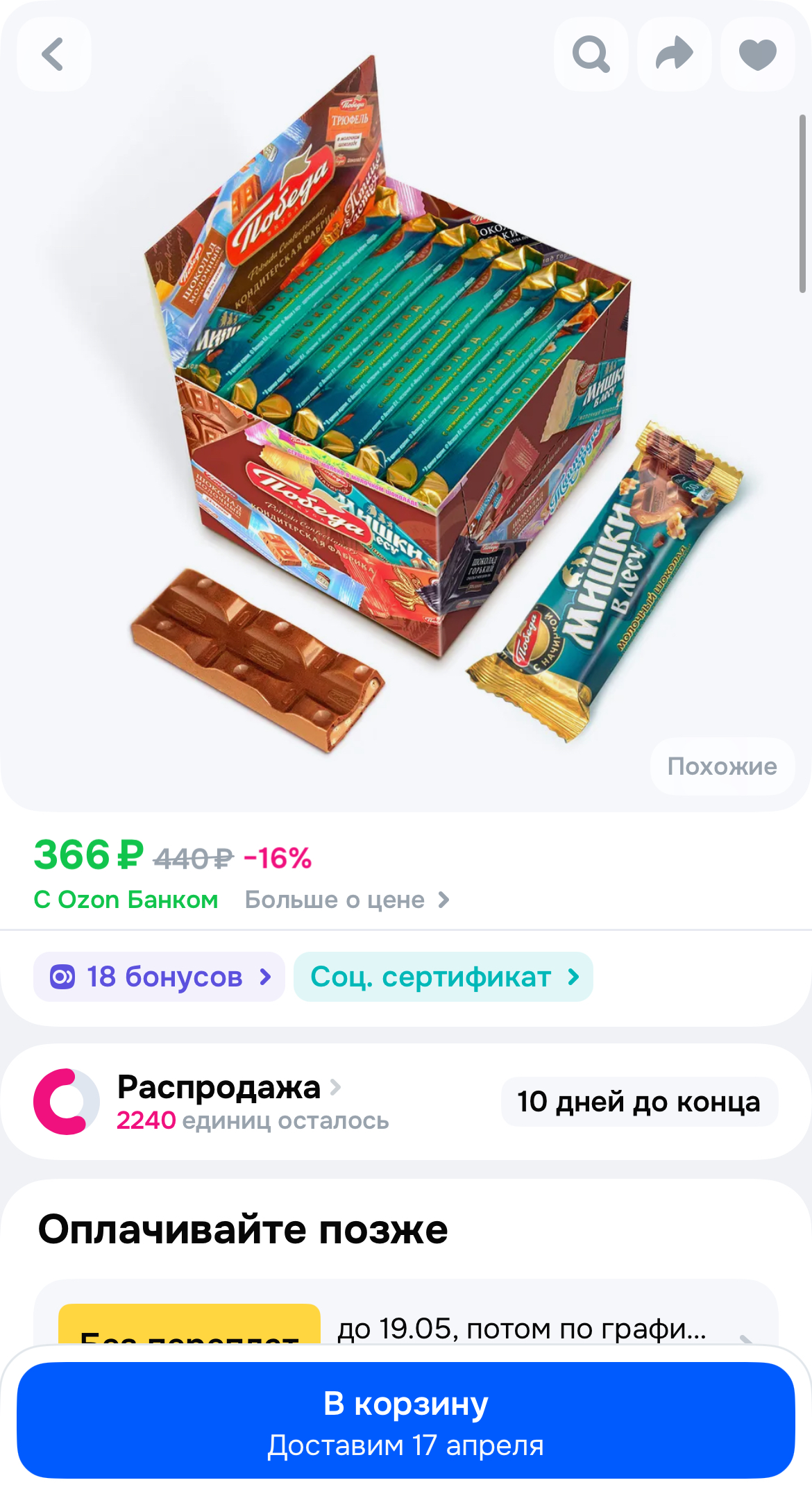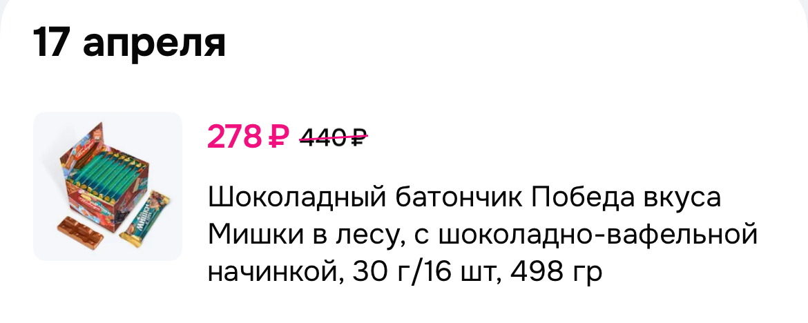 Такая цена у меня вышла с учетом бонусов. Это выходит 17₽ за шоколадку. Выгодно!