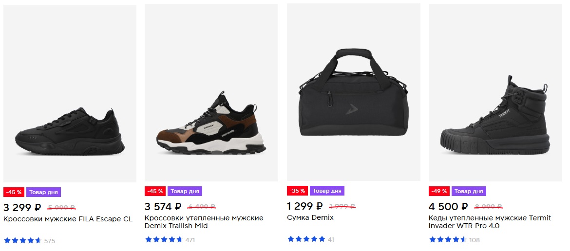Очень щедрые скидки до конца дня на популярные фирмы: FILA, Demix, Kappa, Termit и другие. Можно выбрать сразу несколько размеров и перед выкупом померить и отказаться от ненужного. В веб версии можно списать бонусы.