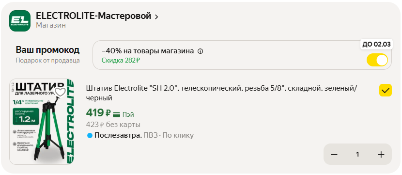 Магазин Electrolite-Мастеровой на Яндекс Маркете даёт скидку 40% за подписку, цена на штатив выходит 423р.