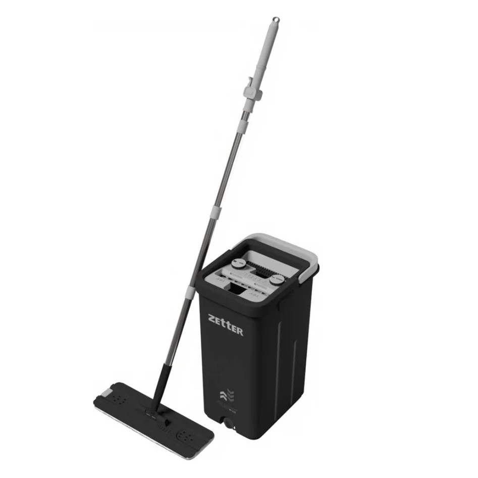 Усовершенствованный комплект для бесконтактной уборки. Ведро 10 л с двойной щёткой и сливным отверстием. Самоотжимной механизм, поворотная насадка 360° на телескопической ручке (139-155 см). Насадка из микрофибры (34×12 см), в комплекте 2 сменные тряпки. Подходит для ламината, плитки, линолеума, паркета. Проникает под низкую мебель. Резиновый демпфер защищает плинтусы.