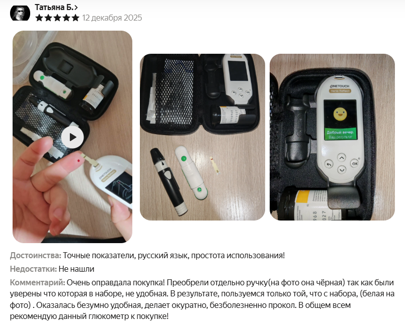 В наборе входит глюкометр, ручка для прокалывания, 10 ланцетов и футляр.