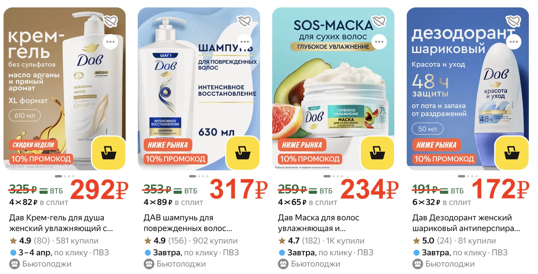 Оставлю подборку уходовых средств бренда "Дав" для тела, волос и лица. Применяй промокод SUBSCRIBEUS в корзине и экономь 10% на заказе!
