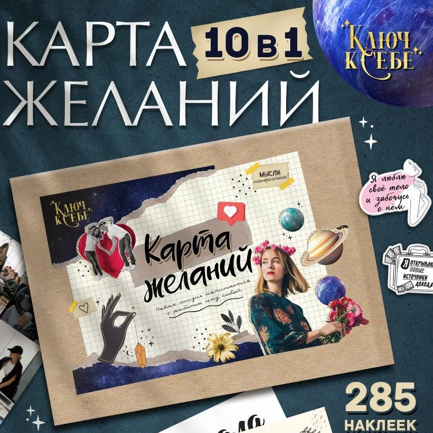 Набор для творчества «Ключ к себе», карта желаний с наклейками, подарочный - всё, чтобы визуализировать мечты: плотная основа, тематические наклейки, инструкция. Можно делать в одиночку или с подругой. Цена 246 ₽.