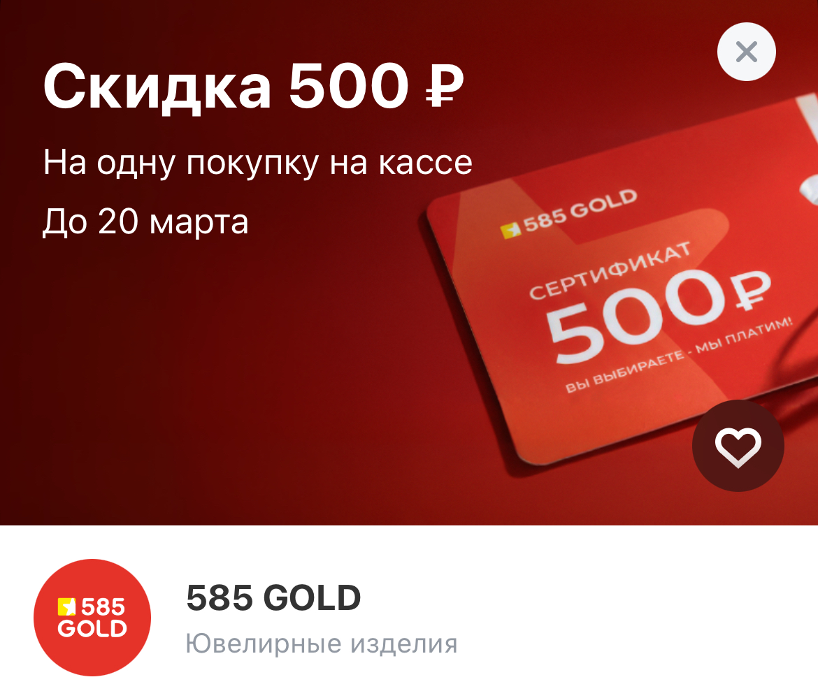 Сработает на одну покупку на кассе магазине. Если украшение стоит меньше 500₽, покупка будет стоить 1₽. Если дороже, то на кассе оплачивается только разница в цене.