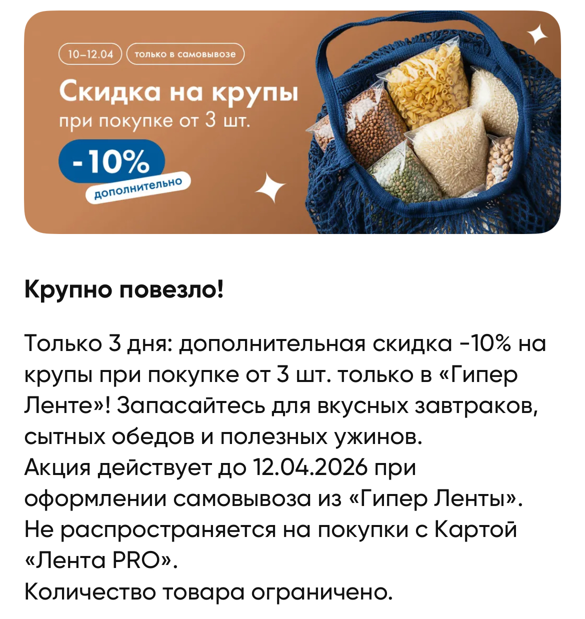 Ещё есть доп.скидка 10% на крупы при покупке от 3 шт. Акция действует до 12.04.2026 при оформлении самовывоза из «Гипер Ленты».