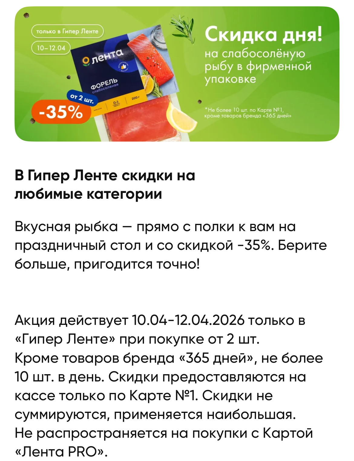 Акция действует 10.04-12.04.2026 при покупке от 2 шт. Кроме товаров бренда «365 дней», не более 10 шт. в день. Скидки предоставляются на кассе только по Карте Nº1. Скидки не суммируются, применяется наибольшая.