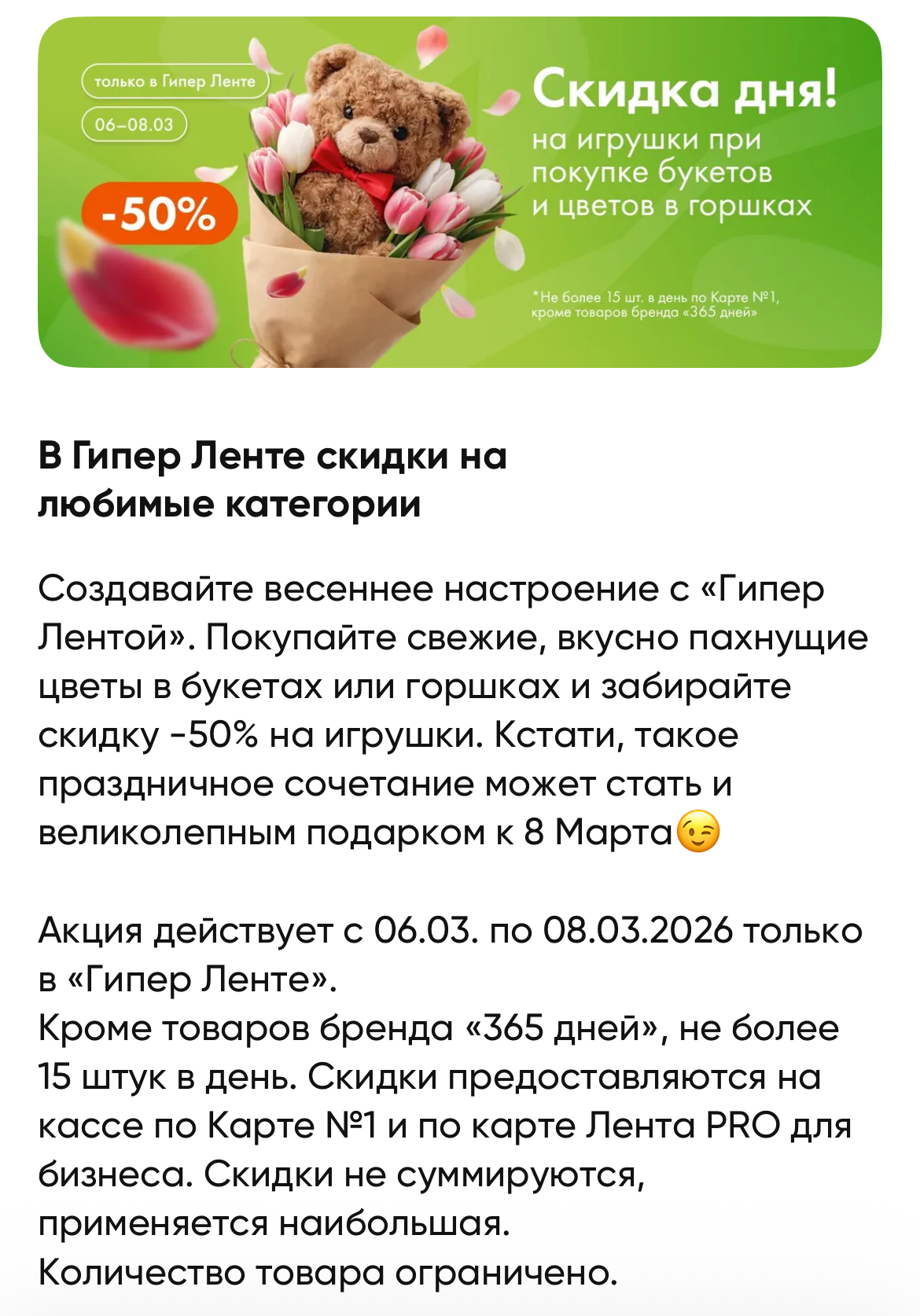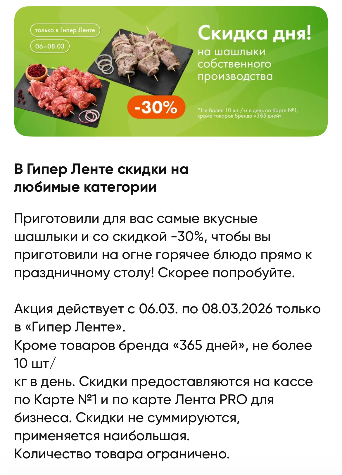Акция попалась в приложении! Скидка сработает автоматически на кассе магазина или КСО при применении карты Ленты. Не суммируется со скидками, сработает наибольшая. Есть ограничение по количеству!