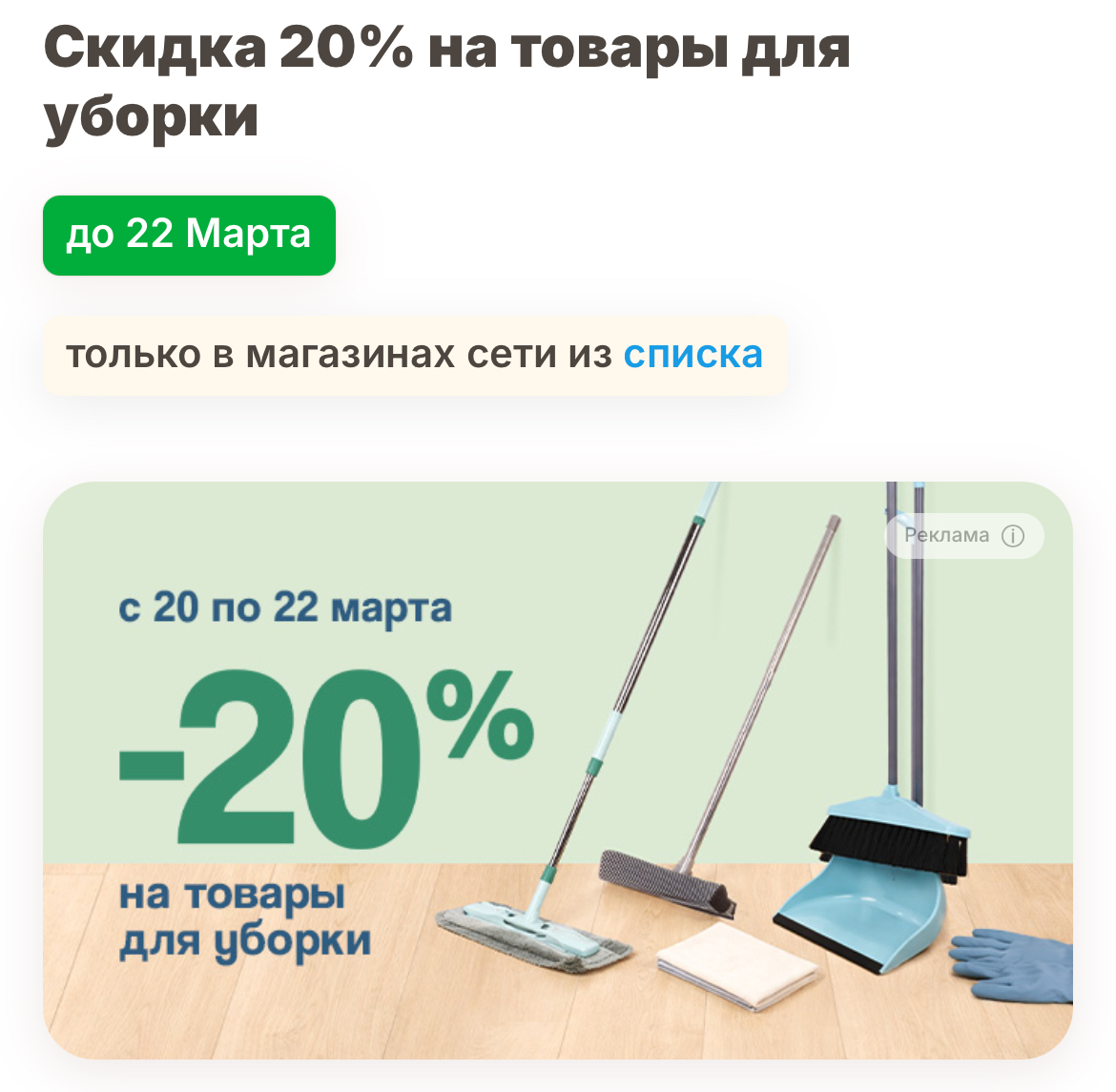 Только с 20 по 22 марта скидка 20% на товары для уборки. Чистота и свежесть в доме по выгодным ценам.