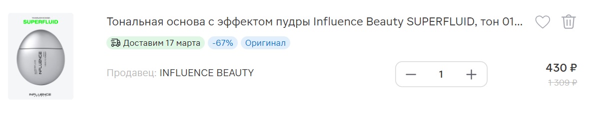 - Тональная основа с эффектом пудры Influence Beauty SUPERFLUID, тон 01 светло-бежевый, 35мл за 430₽