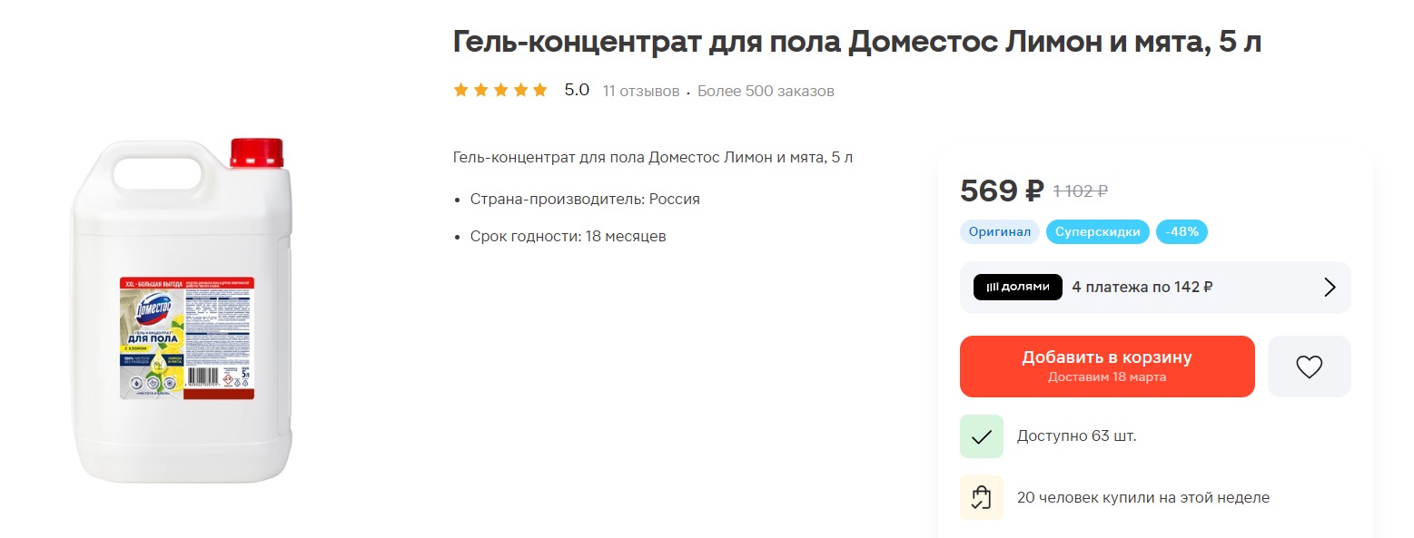 Вот из бытовой химии. Гель-концентрат для пола Доместос Лимон и мята, 5 л за 569₽