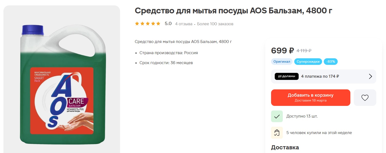 Средство для мытья посуды AOS Бальзам, 4800 г за 699₽