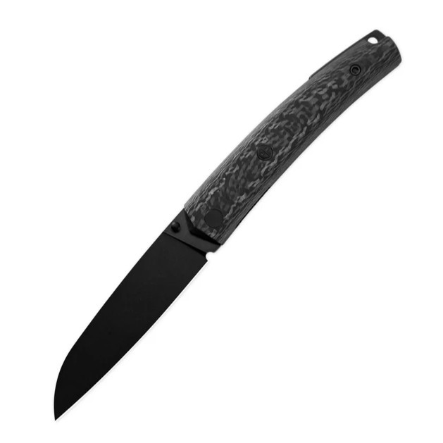 Стильный и лёгкий нож для тех, кто любит натуральные материалы и надёжную сталь в кармане. Подойдёт для походов, кемпинга и повседневных задач. Лезвие из стали 14C28N (твердость 59–60 HRC), обработка сатин/стоунвош/черный PVD. Длина общая 191 мм, лезвие 86 мм, толщина 2.35 мм. Рукоятка из углеродного волокна - каждая партия с уникальным оттенком, вес всего 72 г.