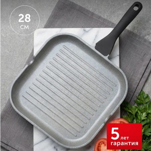 Квадратная сковорода-гриль 28х28 см, изготовлена из алюминия с толстым (5 мм) дном, обеспечивающим равномерное распределение тепла и отсутствие деформации.