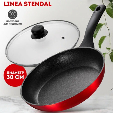 Сковорода имеет диаметр 30 см, утолщенное дно 3 мм и высоту стенок 5,5 см. Ещё есть антипригарное покрытие Xylan, стеклянная крышка с пароотводом, бакелитовую ручку с термоизоляцией. Подходит для индукционных плит! Изготовлена из кованого алюминия.