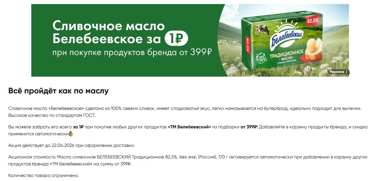 Сливочное масло Белебеевский, 170 г за 1₽ при заказе от 399₽