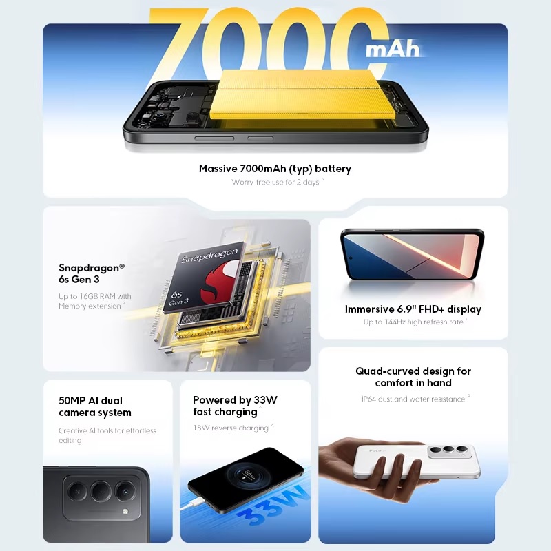 Хороший смартфон для своего бюджета. Модель с огромным аккумом 7000 мАч, процессором Snapdragon 6s Gen 3, 6/128 GB памяти, 6.9 дюймовый дисплей с частотой обновления 144 Гц, камера основная на 50 МП, фронтальная 8 МП.