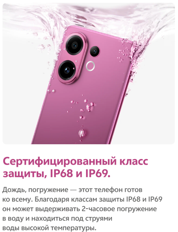 Тонкий корпус, 6,77-дюймовый AMOLED экран, процессор Snapdragon 7 Gen 4, защита IP68/69, камера 50 Мп с оптикой Zeiss и трёхкратным зумом, есть сканер отпечатка пальца и разблокировка по лицу.