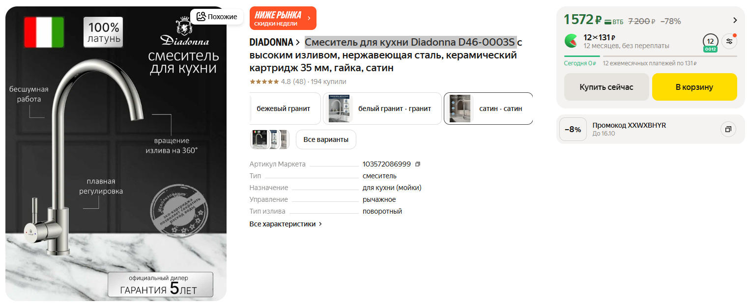 Хорошая цена выходит со скидкой 8% по коду. Модель с высоким изливом (392 мм), поворотная, из нержавеющей стали с сатиновым покрытием. Керамический картридж 35 мм - надёжный и долговечный. Гибкая подводка в комплекте, монтаж на столешницу.