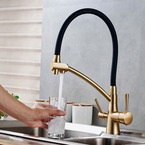 Хорошая цена благодаря купону от продавца, плюс ещё и доставят быстро в пункт выдачи. С таким смесителем удобно мыть посуду, наполнять кастрюли прямо в раковине или набирать воду в высокие ёмкости. Высота у него 42 см, управление 2 рычагами: для питьевой и водопроводной воды, внутри керамическая пластина. Доступно несколько цветов. Отзывы хорошие, много фото.