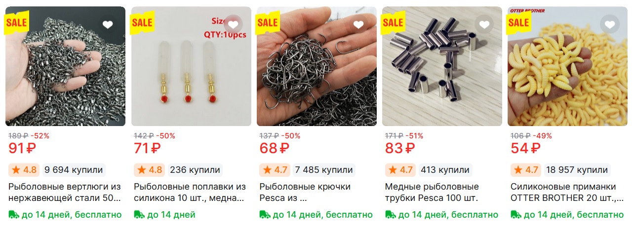 Собрал подборку рыболовных снастей и приманок с AliExpress. В ассортименте представлены крючки, мягкие и силиконовые приманки, вертлюги и другие аксессуары по низким ценам. На товары действует бесплатная доставка.