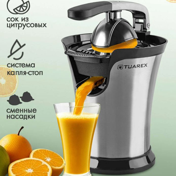 Мощность 160 Вт, две насадки - для крупных и мелких плодов. Корпус из нержавейки. Есть система «анти-капля», чтобы на стол не текло. Все съёмное моется легко.