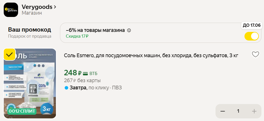 Нашёл большую пачку соли с дополнительной скидкой 6% за подписку на магазин.