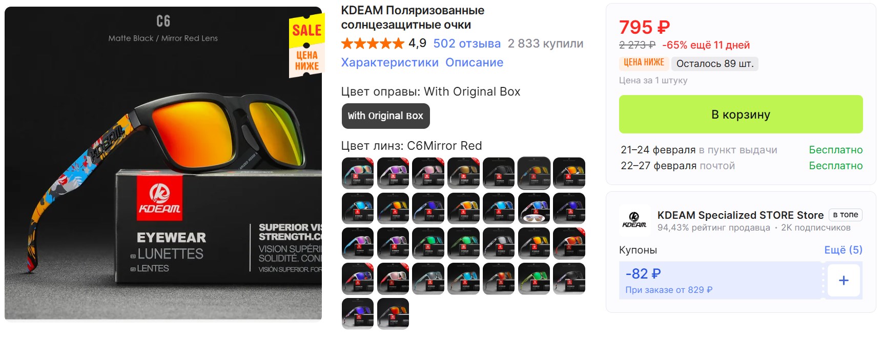 Поляризованные линзы с зеркальным покрытием и защитой UV400. Оправа из поликарбоната - лёгкая, гибкая, для длительного ношения подходит.