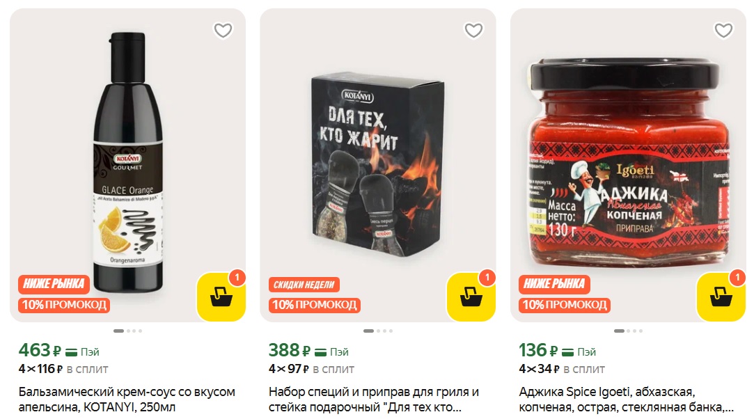 Качественные и известные бренды приправ. В каталоге большое разнообразие товаров, есть аджики в банках, специи в мельницах, в пакетах, соусы в бутылках.
