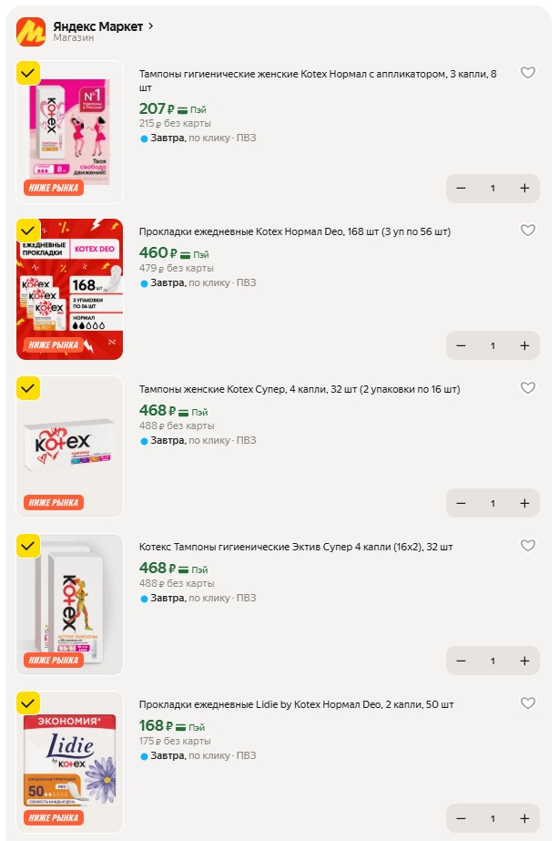 На Яндекс Маркет сейчас неплохие цены на продукцию Kotex, если ловить момент с любимой категорией недели. Лови небольшую подборку того, на что стоит обратить внимание: