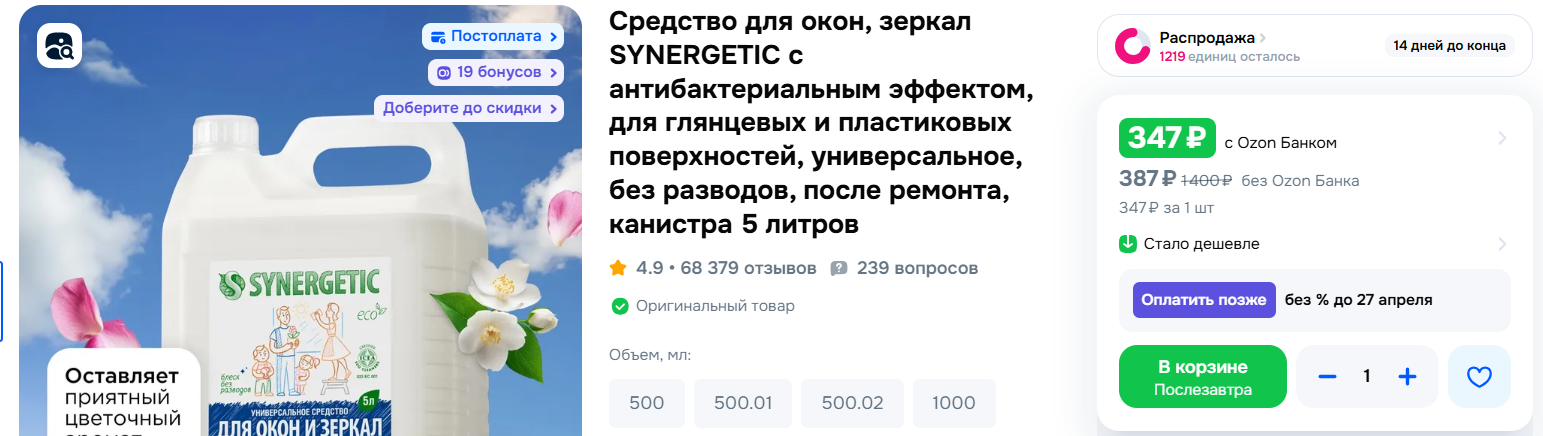 Самая низкая цена на него, но надо промокод применить. Сама таким пользуюсь, не оставляет разводов, запах приятный, не спиртовой.