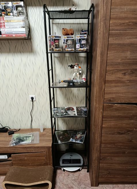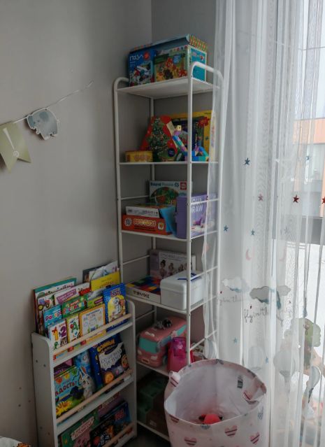 Очень простая сборка, справилась одна минут за двадцать, даже шуруповерт не понадобился, всё легко закручивается отверткой, пазы входят идеально, с деревянными стеллажами больше мороки обычно. Легкий, но надежный, не шатается, к стене пока не крепила, в углу вообще не двигается на ровном полу.