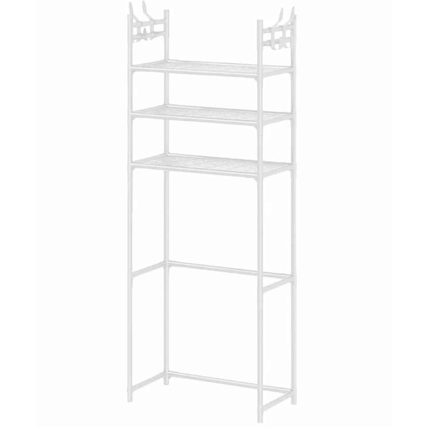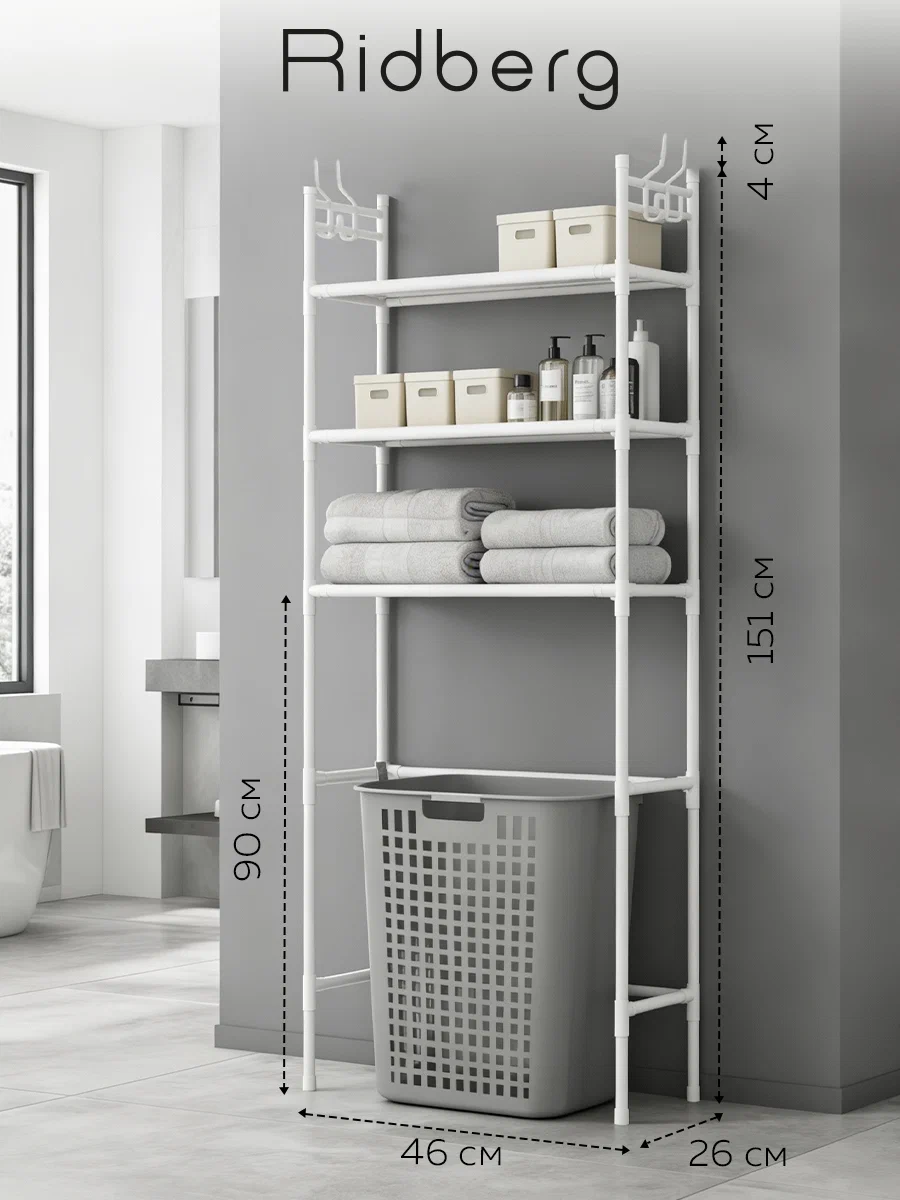 Самая низкая цена! Узкий и высокий — ставится за унитаз или впритык к стиралке, не занимая полезное пространство. Три текстильные полки, всё шампуни-гели-порошки влезают. Каркас металлический, труба 16 мм, весит1,2 кг. Коррозии не боится, для влажной среды самое то.