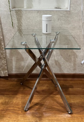 Столешница - закалённое стекло 6 мм (выдерживает горячее до 120°C, можно чай ставить без подставки), ножки - металлические, крест-накрест, стиль under.