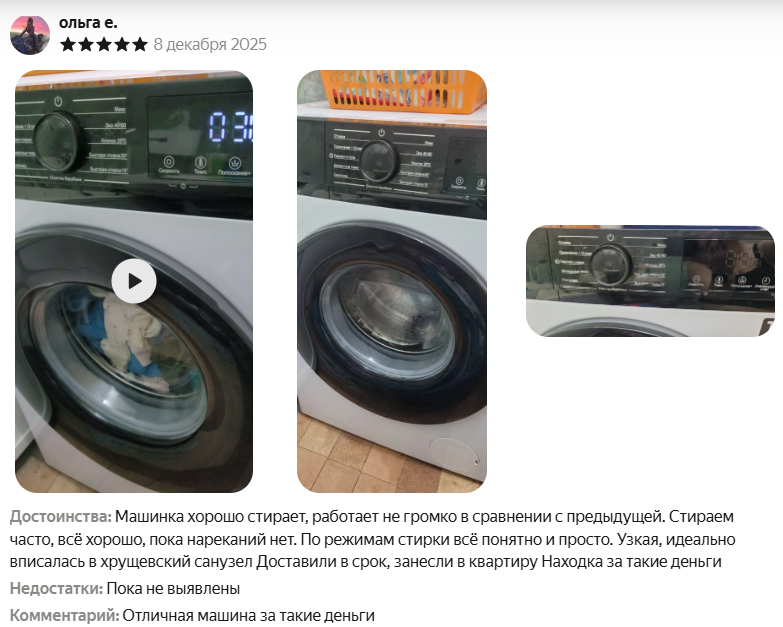 Это самая низкая цена среди магазинов. Глубина всего 40,5 см, вместительная (на 7 кг белья). Инверторный мотор работает тихо. Полная защита от протечек. Есть подача пара. Отзыов у нее много, приложу парочку