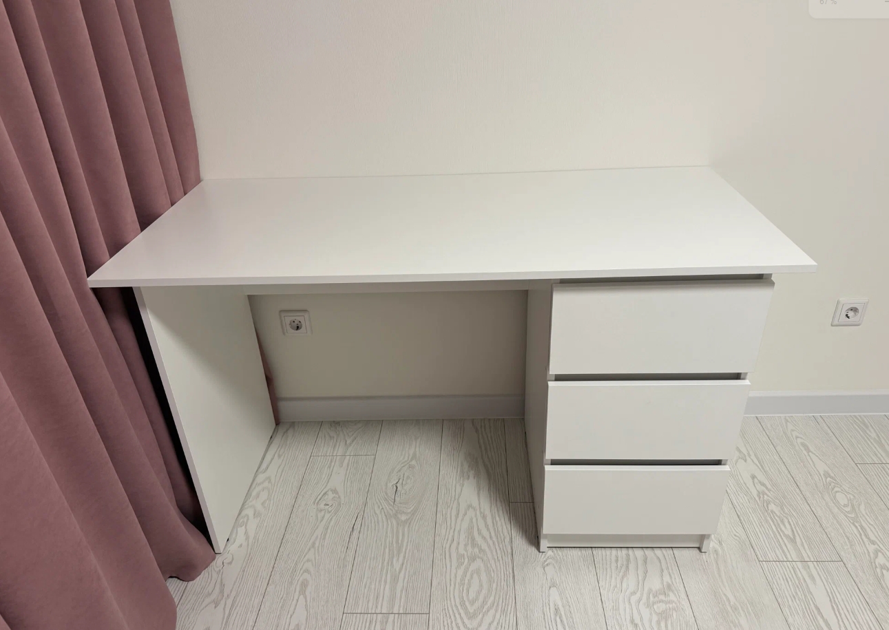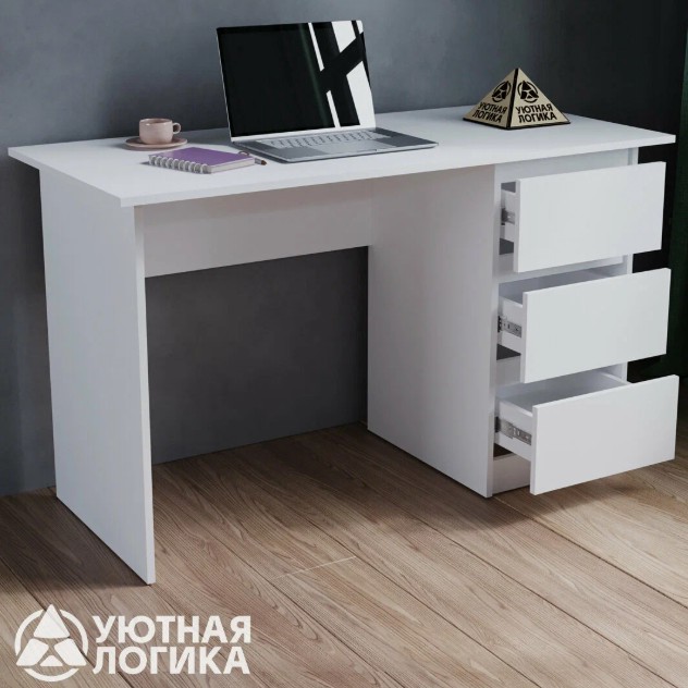 Стол большой: 130 на 60 см, места хватит и для компа, и для учебы или работы. Три ящика, куда можно тетрадки или всякую мелочь сложить. Их можно слева или справа поставить - удобно. Ножки металлические, регулируются, пол не царапают. Материал ЛДСП, без запаха, для детской норм.