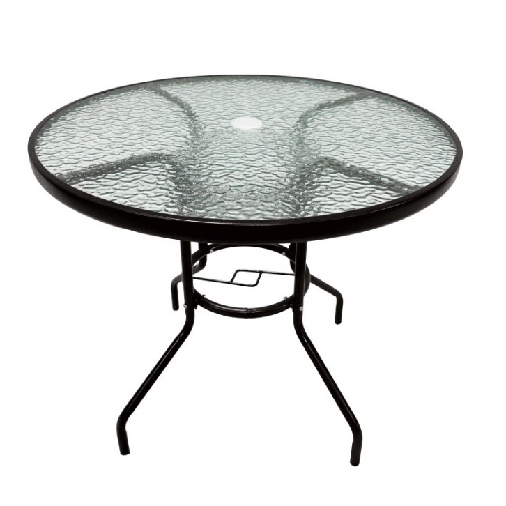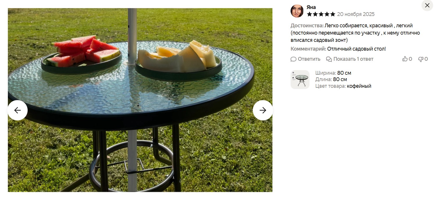 Привет. На Маркете сейчас круглые столы Homsly по нормальным ценам. Столешница из закалённого стекла с рельефным узором, по краю металлическая окантовка, каркас металлический. Не выгорают на солнце, не боятся дождя и снега. В центре отверстие под зонт - для дачи или веранды самое то.