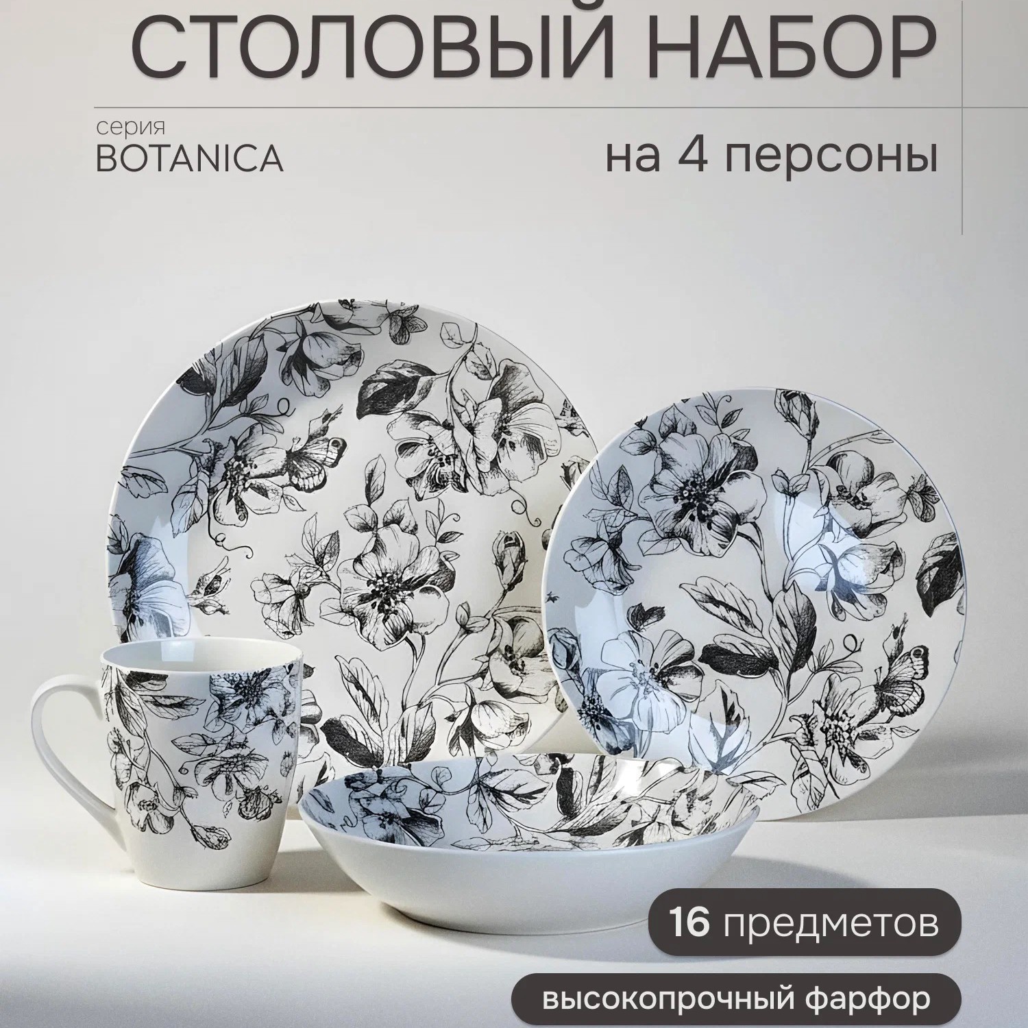 Комплект большой 16 предметов: глубокая тарелка (для супа, салата с заправкой), мелкая тарелка (для второго), десертная тарелка и чашка. Изготовлен из фарфора, материал прочный, выдерживает мойку в посудомоечной машине и разогрев в микроволновой печи.