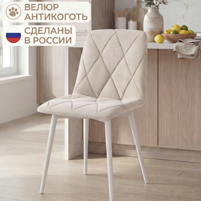 Цвет - очень приятный бежевый велюр. Смотрятся просто как в ресторане, очень нежно и дорого. На ощупь мягко, пыль не притягивает, выглядят уютно. Каркас стальной, крепкий - нагрузка до 130 кг заявлена, так что можно не бояться, что разболтаются.