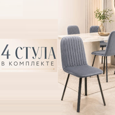 Нашёл на Яндекс Маркете стулья для кухни «Чили» - 4 штуки за 9086рублей, цена норм. Обивка из мягкого велюра, серые. Ножки чёрные, металлические. Сиденье и спинка мягкие, выдерживают до 130 кг. Выглядят стильно, ухаживать за ними просто. Делится находкой просто так.