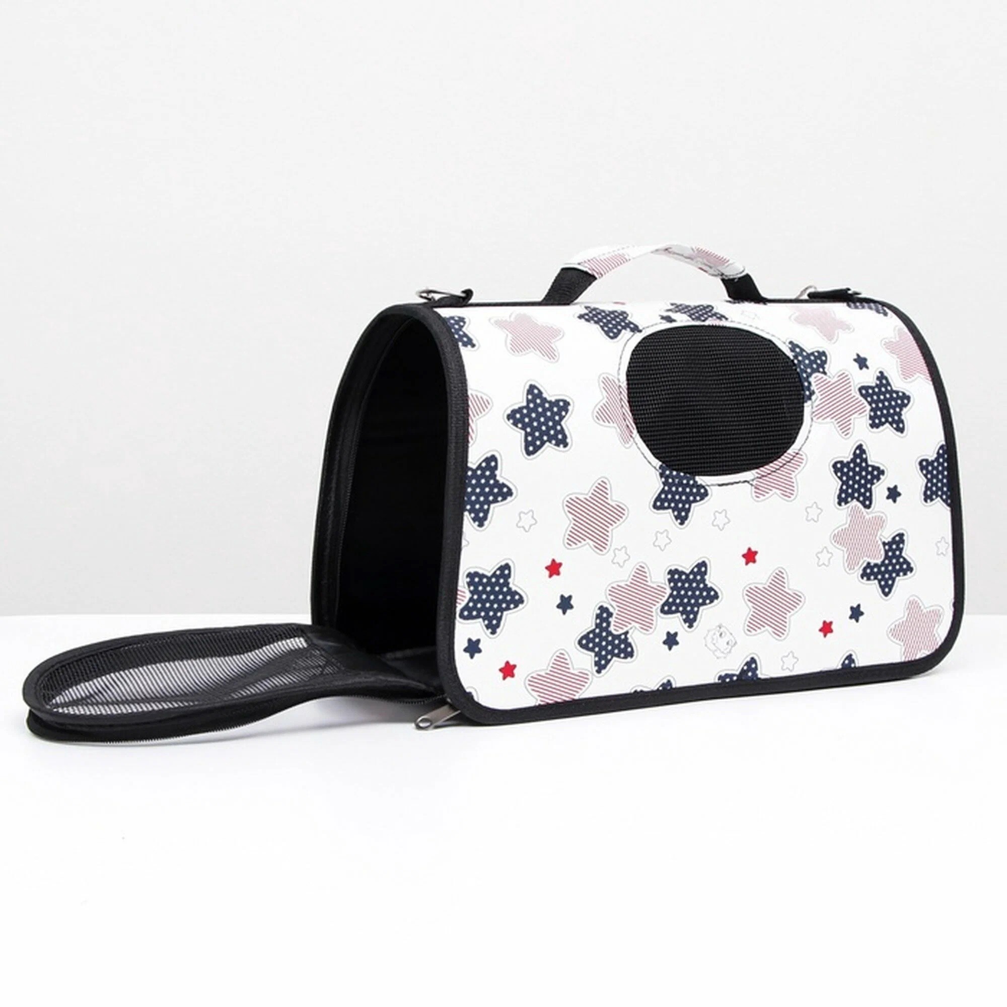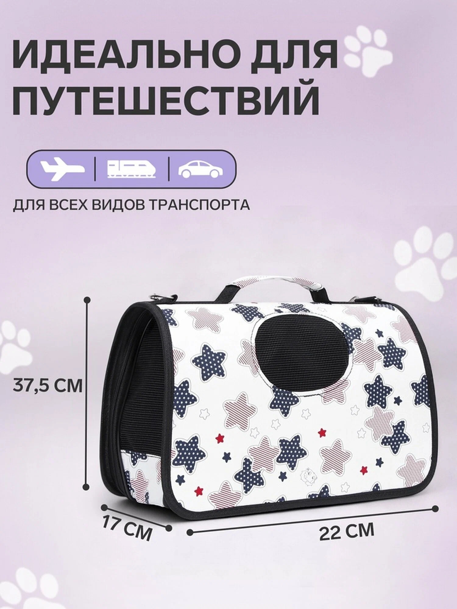 Лёгкая и удобная сумка-переноска для мелких домашних животных весом до 3 кг: кошек, собак, хомяков, крыс и других. Имеет прозрачную сетчатую вставку для обзора и вентиляции, жёсткое дно из плотного картона. Размер 37.5х17х22 см, компактно складывается.