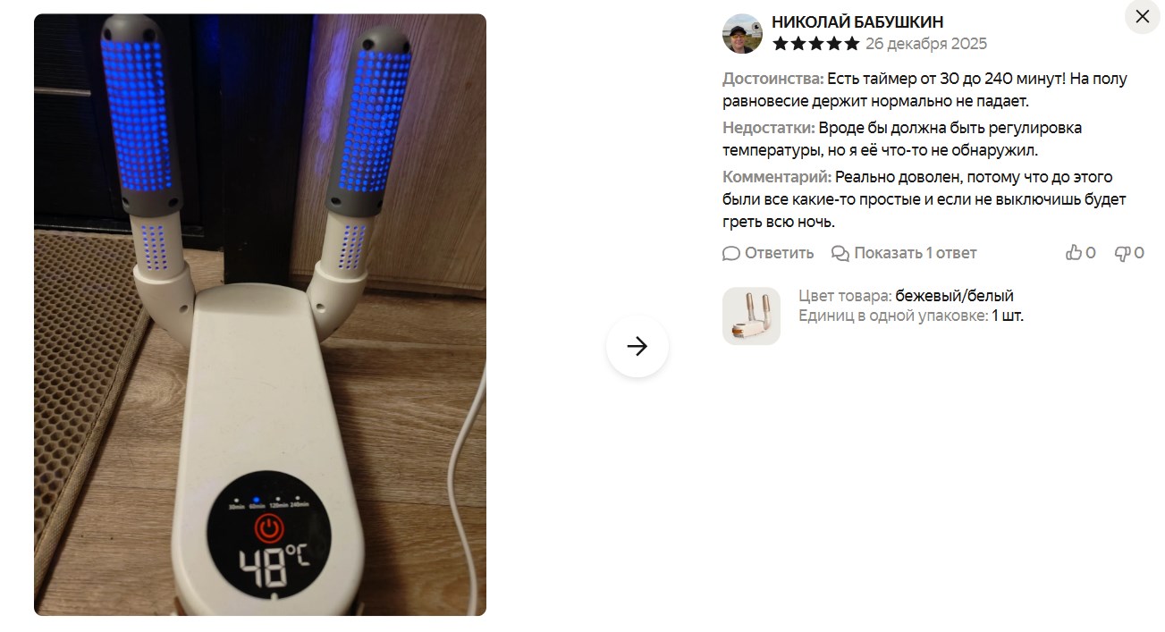 Маленький прибор, но дело делает: не просто сушит, а ещё и ультрафиолетом дезинфицирует. Актуально, если обувь синтетическая и со временем запах появляется. Ну или просто промок где-то - быстро высушит без вреда, там температура всего 48 градусов.