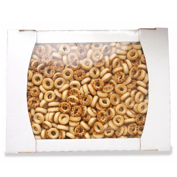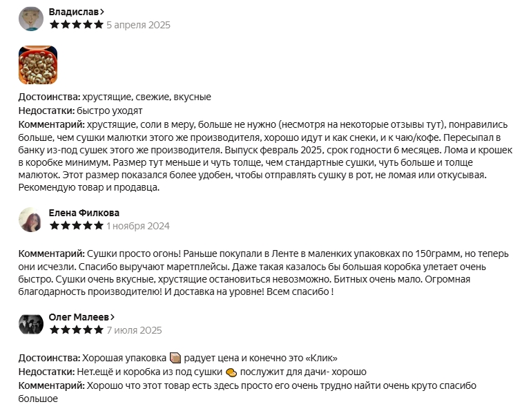 Обычные сушки с солью, но в очень большой пачке - 3,5 килограмма. Производитель пишет, что они "пухленькие, кругленькие и посыпанные кристалликами соли". В общем, классика.